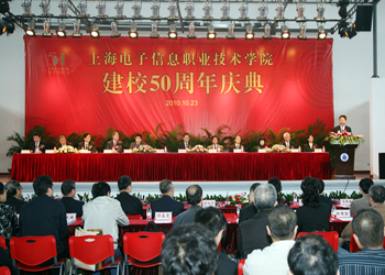 庆典大会上,上海市副市长沈晓明向学院50周年华诞表示热烈祝贺,并充分肯定了学院50年来的教学成果。他说,上海电子信息职业技术学院在半个世纪的发展历程中,始终坚持党的教育方针,以培养人才为己任,以社会需求为导向,培养了大批高素质职业技能型人才,为上海的经济建设和社会发展做出了巨大的贡献。他还祝贺上海电子信息职业技术学院在今年成功入选国家骨干高职院校建设单位。他表示目前上海市正在加快推进“四个率先”、加快建设“四个中心”和社会主义现代化国际大都市的宏伟事业,迫切需要包括电子信息等专业方面的各类职业技能人才。希望学院抓住机遇,乘势而上,继续深化教育教学改革,不断探索,创新形式,为经济社会培养更多更好的人才。
