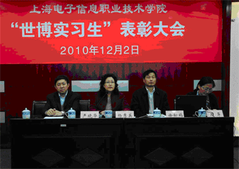 最后, 杨秀英院长作了讲话,赞扬了我院实习生不辱使命,以高度的责任感、荣誉感和使命感,在世博会技术服务与安全管理的实践中,发挥了主人翁精神,用自己的热心、爱心、诚心、耐心和坚强的意志力为世博会提供了最热情、最真诚的服务,用实际行动践行了世博精神,在世博这个大舞台上展示了中国青年良好的精神面貌,体现了实力,锻炼了队伍,扩大了影响。并希望我院师生继承、发扬和升华服务世博的工作精神,将其转化为推动学院事业发展的强大动力,为早日实现学院建成国家骨干高职院校的战略目标而不懈奋斗。