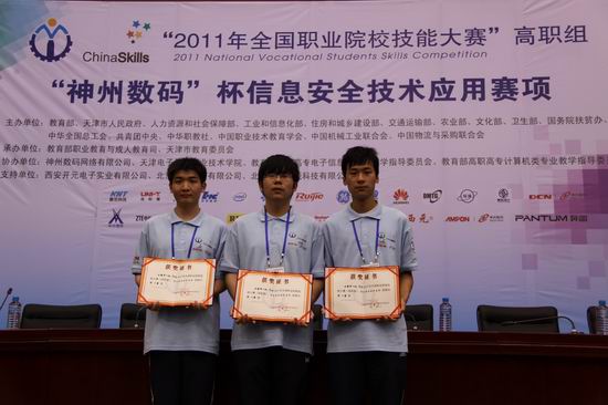 2011年全国职业院校技能大赛于6月24号至27号在天津举行,由我院计算机应用系学生刘磊、操召旺、张文炳和指导教师邱洋,计大威组成的代表队,从全国37个省、市、自治区的代表队中脱颖而出,勇夺"神州数码"杯信息安全技术应用赛项技能比赛一等奖。