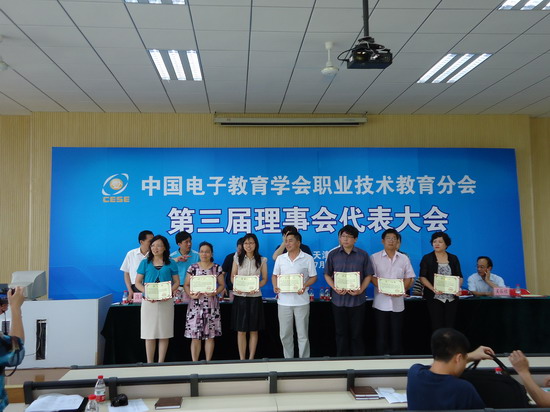 中国电子教育学会职业技术教育分会第三届理事会代表大会于2011年7月16日-18日在天津召开。来自31个理事单位的71名代表参加了会议。本次会议的主要议程有四个:一是职教分会网站开通;二是宣读职业教育科学研究优秀成果奖、优秀教材及先进单位的表彰决定、颁奖;三是审议第二届理事长工作报告、财务工作报告及学会章程修正案说明;四是审议通过第三届理事会机构组成及人员名单。