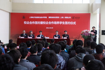 3月5日上午,我院与摄阳自动化贸易(上海)有限公司校企合作暨校企合作培养学生签约仪式在奉贤校区隆重举行。摄阳自动化贸易(上海)有限公司总经理谢坤松、副总经理崎原竜司、副经理王茹、干事戴丽靓、丁永春,三菱电机自动化(中国)有限公司日资客户部部长水口刚,学院领导杨秀英、顾剑锋,徐松鹤、严晓华、周俊瑜等出席签约仪式。