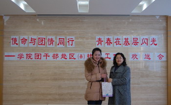 学院党委书记、院长杨秀英老师从“团情”和“闪光”两方面对挂职团干部提出了希望和要求,并送上了学院的祝福。一要充分体现青年团干部的朝气蓬勃,起到骨干引导作用,利用这次机会认真了解所在地工作的基本状况,找准地方工作的切入点;二是要在基层闪光,能够保持质朴的本质,积极融入基层,加强学习与交流,发扬吃苦耐劳的精神,树立信息学院共青团干部的积极形象,为学院增光添彩!