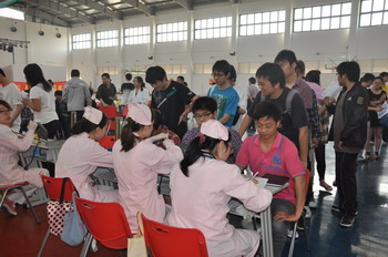 上午8:30,第一批献血的同学们准时来到室内体育场。在完成了表格填写、身份核对、血样抽取和血压测量等准备工作后,便陆续进入献血区开始献血。大家面带笑容、心情放松地伸出温热的手臂,让鲜红的血液缓缓流入采血袋,用自己的热血书写着一曲生命的赞歌。