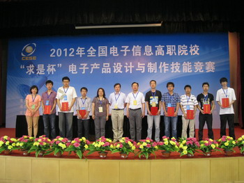 由中国电子教育学会主办的“2012年全国电子信息高职院校技能大赛”即“求是杯”电子产品设计与制作技能大赛于6月10日在北京信息职业技术学院举行。由电子系冯铁成老师和中德学院李云庆老师指导,电子系学生强浩、刘朋、张心盼组成的上海二队和花建昌、刘欣迪、万廷胜组成的上海一队分别获得了团体一等奖和团体二等奖的好成绩。