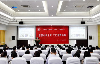 学院党委书记、院长杨秀英作了题为《思想引领未来 文化造就品质》工作报告,报告对学院2010年以来的思想政治教育和文化建设工作进行了全面回顾。两年来,学院以骨干院校建设为中心,扎实开展凝聚共识思想教育活动,使全体教职工在院校建设中迸发出前所未有的工作热情和创造力;利用“两课”主阵地对学生持续开展系统地、全面地马克思主义理论、思想品德和中国特色社会主义理论体系教育;利用业余党校深入开展理想信念教育;利用第二课堂及“博文讲坛”进行“热点教育”;借世博、建党90周年系列活动,激发学生爱党爱国爱校情怀;推动各类主题活动,培养学生感恩奉献、责任诚信等综合素质;推动“文明双创”,养成学生良好行为习惯;支持各类社团活动,锻炼培养学生自主能力;开展“感动校园”十佳评选,弘杨立足本职、爱校爱岗精神;开展各类文体活动,陶冶学生情操;把解决实际问题和培养学生健全人格结合起来;全面提升辅导员队伍工作水平。杨书记的报告还从四个方面对今后学院的思想政治教育和文化建设工作指明了方向。一是指导思想、工作要求和目标任务。二是根据高职人才培养要求,进一步增强思政教育和文化建设内驱力。三是以师德学风建设为重点,强化育人队伍素质建设。四是细化育人工作体系,构建育人新格局。