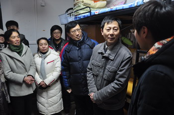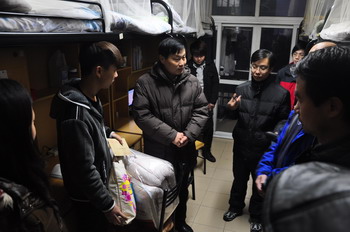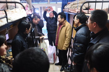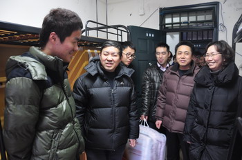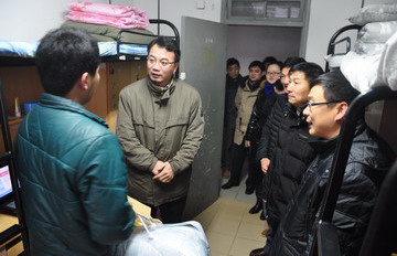 2013年1月8日傍晚,学院领导杨秀英、顾剑锋、徐松鹤、严晓华、吴依本、周俊瑜,院长助理林春方、胡国胜,党办、院办、学工部等相关职能部门负责人和各系部(二级学院)党支部书记分别走访学生宿舍,关心慰问家庭经济困难学生,把爱心大礼包、冬被、爱心屋衣物专用券等生活学习用品送到他们手中,给他们带去心灵的温暖。
