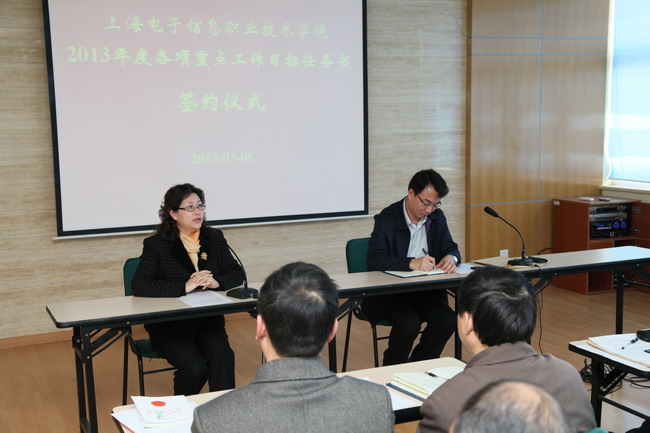 3月8日上午,学院举行2013年度各项重点工作目标任务书签约仪式,学院领导杨秀英、顾剑锋、徐松鹤、严晓华、吴依本、周俊瑜等分别与主管副院长、党支部代表、部门代表签订了2013年党委工作、行政工作、党支部工作、党风廉政建设、稳定与综合治理工作、安全生产工作目标任务责任书。