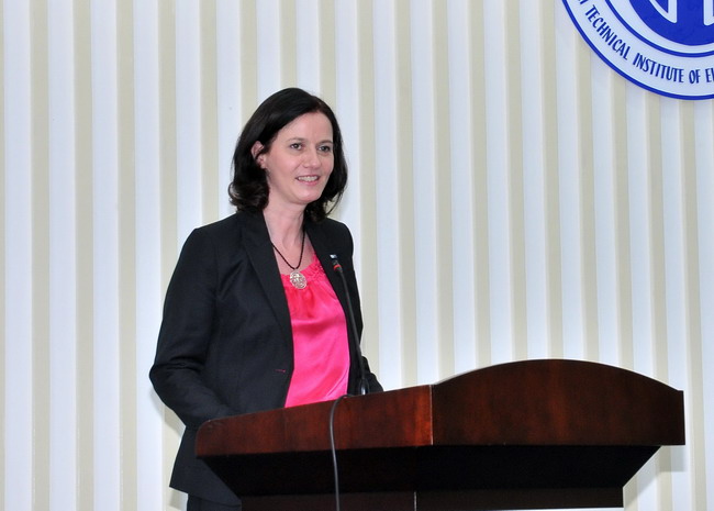 上海电子信息职业技术学院党委书记、院长、中德学院院长杨秀英代表学院领导和全校师生,向顺利毕业及获得技术员证书的学生表示祝贺,向始终关心和支持项目运作的各级部门、社会各界、教职员工和德方人员表示感谢。杨院长希望即将走向社会的学生们能永远保持一颗积极进取之心,勤于学习,善于思考;能时刻坚守一份责任之心,热爱劳动,崇尚技能;能持久拥有一颗宽容之心,快乐豁达,热爱生活;常怀感恩之心,以感恩之心升华责任之心、博爱之心,回报家庭和社会。杨院长衷心祝福同学们事业有成、早日成为社会之栋梁!她说,母校永远惦念着你们,中德学院永远惦念着你们,老师和学弟们关注着你们!期待着你们为母校、为中德学院增光添彩!