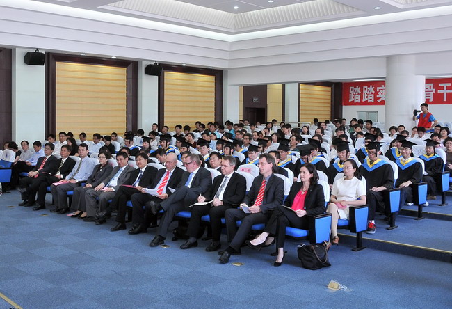 教育部职业技术教育中心研究所刘立新副所长、上海市教育委员会高教处副处长许涛、学院领导杨秀英、顾剑锋、徐松鹤、严晓华、吴依本、周俊瑜、院长助理林春方、胡国胜以及德方嘉宾德国巴伐利亚州文教部职教司司长格尔曼∙登内博格、卡尔•彼得•欧博迈耶学校校长鲁道夫•沙赫尔、汉斯•赛德尔基金会项目负责人汉斯•凯夫勒、兰茨胡特应用技术大学弗里茨•珀恩巴赫、德国工商大会(AHK)上海代表处职业教育总监白丽塔等出席毕业典礼。