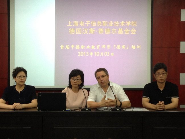 据介绍,作为培训项目的一个重要组成部分,我院已于2013年10月3日在徐汇校区举办了培训班的国内培训。上海电子信息职业技术学院院长兼上海电子工业学校校长杨秀英、德国汉斯•赛德尔基金会驻我院长期专家凯夫勒等参加了国内培训的开班式并为学员授课。
