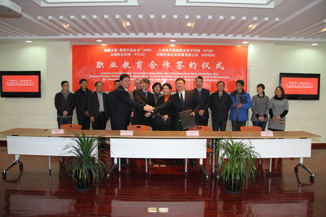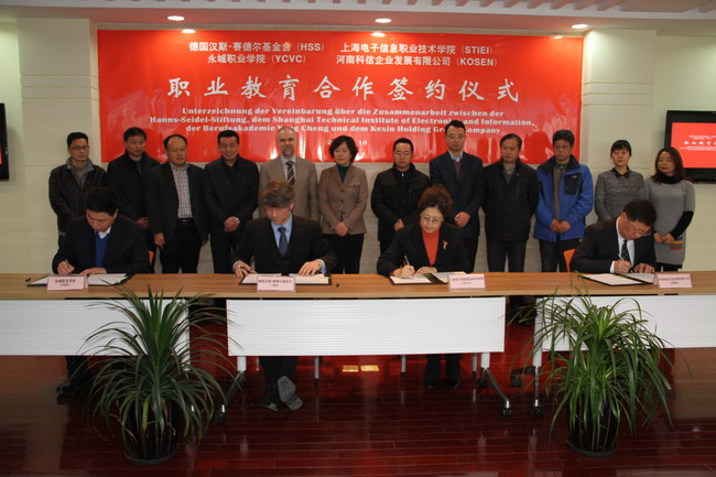 2015年1月10日,《关于开展中德职业教育领域合作备忘录》四方签约仪式暨河南省高等专科(职业院校)第一期师资培训班开班仪式在我院举办。汉斯·赛德尔基金会项目负责人绍贝德、上海市教育委员会高教处副处长赵坚、河南省教育厅国际处副处长关煜平、河南永煤集团董事长曹志安、河南科信企业发展有限公司董事长韦强启、河南机电学院副院长戚新波、永城职业学院副院长荣向东、学院党委书记、院长杨秀英、党委副书记、副院长顾剑锋等出席签约暨开班仪式,并发表讲话。