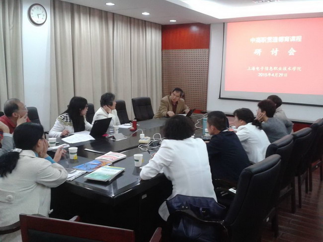 2015年4月29日下午, 中高职贯通德育课程研讨会在徐汇校区召开,会议邀请了上海市中职德育研究会秦德英老师和上海市教委教研室关月梅研究员两位专家,还邀请了上海材料工程学校、上海市经济管理学校、上海市南湖职业学校和上海市工业技术学校的相关领导和老师。学院副院长徐松鹤参加会议。