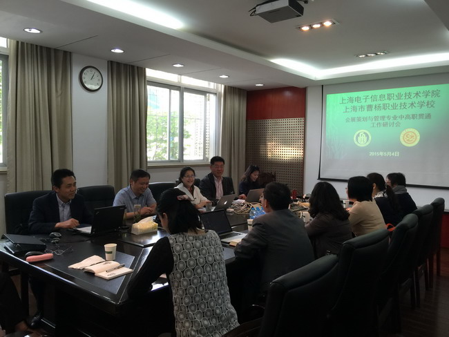 2015年5月4日,由我院和上海曹杨职业技术学校联合申报获批《会展策划与管理》专业中高职教育贯通培养项目工作研讨会在我院徐汇校区召开。我院党委书记、院长杨秀英、上海曹杨职业技术学校徐寅伟及相关职能部门人员共11人参加了本次会议。