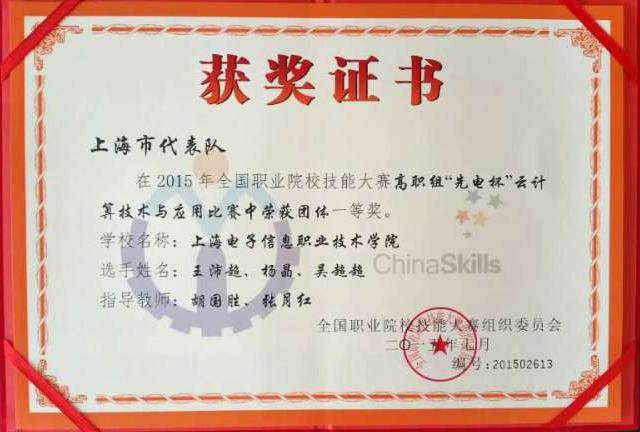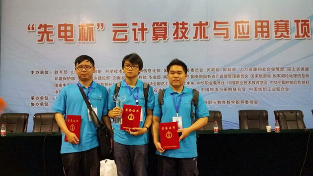 6月14日,2015年全国职业院校技能大赛“先电杯”云计算技术与应用赛项在山东商业职业技术学院落下帷幕,由我院计算机应用系教师胡国胜、张月红指导的学生王沛超、吴超超、杨晶组成的上海市代表队,在4个小时的激烈角逐中顽强拼搏、团结奋战,荣获团体一等奖。