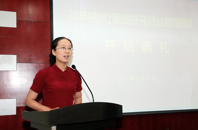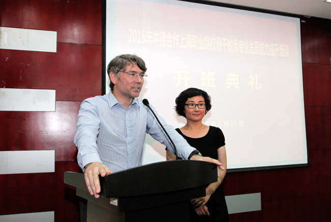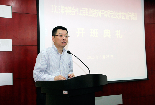 2015年6月25日,中德合作上海中高职职业院校骨干教师能力提升培训开班仪式在我院举行。上海市教委副主任陆靖、上海市教委高教处副处长赵坚、上海市教委职成教处副处长张福顺、上海市教委教育技术装备中心副主任周齐佩、上海电子信息职业技术学院党委书记、院长杨秀英、德国汉斯·赛德尔基金会项目负责人绍贝德、德国工商大会(AHK)上海代表处职业教育经理陈丽玮等出席开班式。