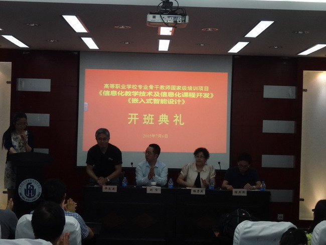 开班典礼于7月6日举行,上海市教育委员会高教处副处长赵坚、上海电子信息职业技术学院党委书记、院长杨秀英、培训班合作企业大唐邦彦(上海)信息技术有限公司总经理程熙熙以及相关领导出席了开班典礼。来自全国30余所高职高专学校的42位骨干教师参加此次培训。