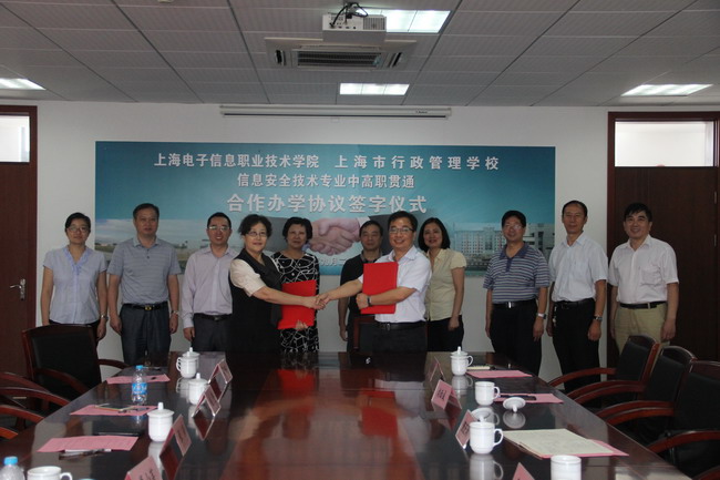 2015年9月26日,我院与上海市行政管理学校举行“信息安全技术”专业中高职贯通签约仪式。上海市教委职教育处副处长戴小芙、发展规划处副处长张兴、高教处副处长赵坚出席仪式并做了重要讲话。 上海市行政管理学校张慧红书记主持签约仪式。上海电子信息职业技术学院党委书记、院长杨秀英、上海市行政管理学校查正和校长出席仪式并分别代表各自学校签约。