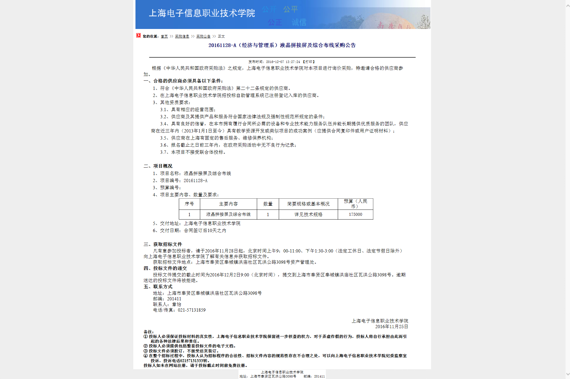 20161128-A(经济与管理系)液晶拼接屏及综合布线采购公告