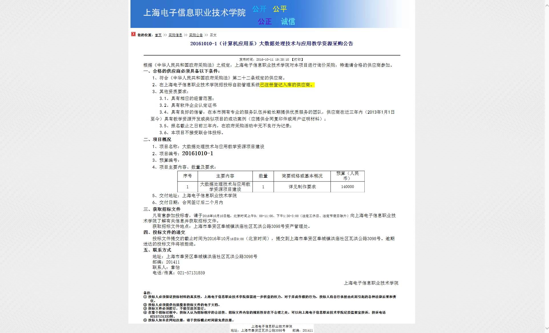 20161010-1(计算机应用系)大数据处理技术与应用教学资源采购公告