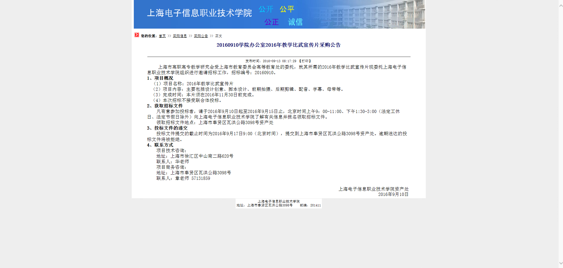 20160910学院办公室2016年教学比武宣传片采购公告