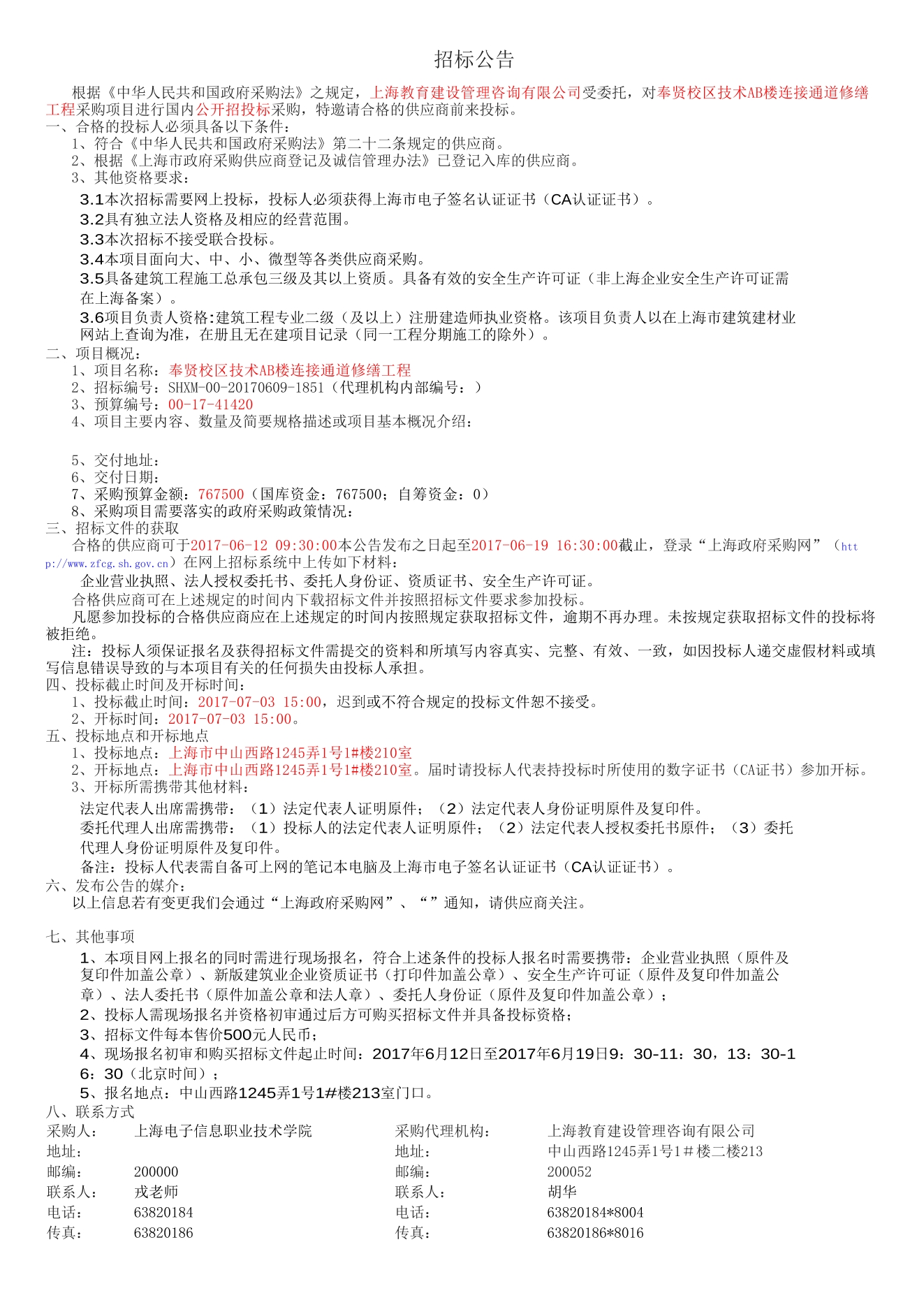 奉贤校区技术AB楼连接通道修缮工程招标公告