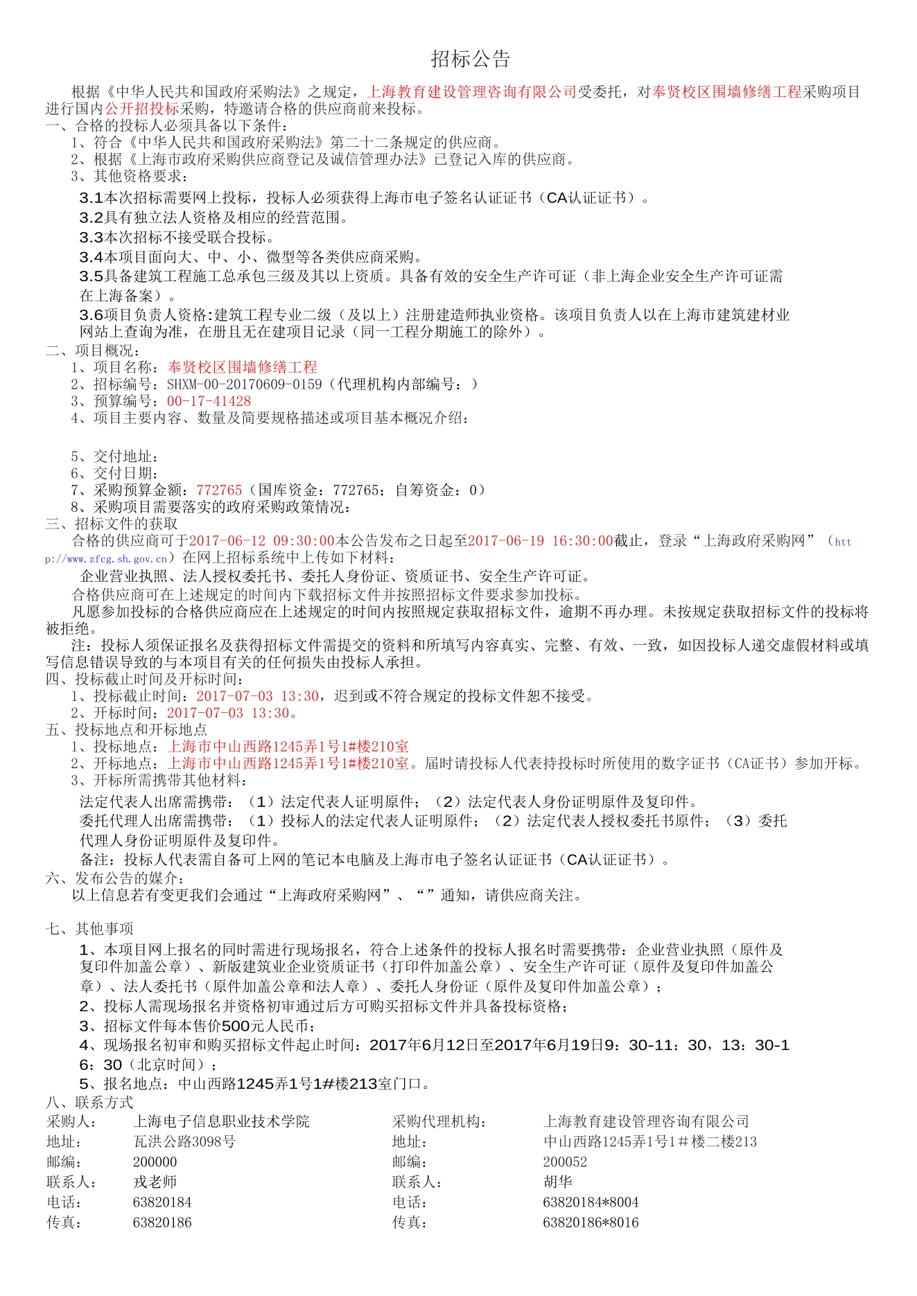 奉贤校区围墙修缮工程招标公告