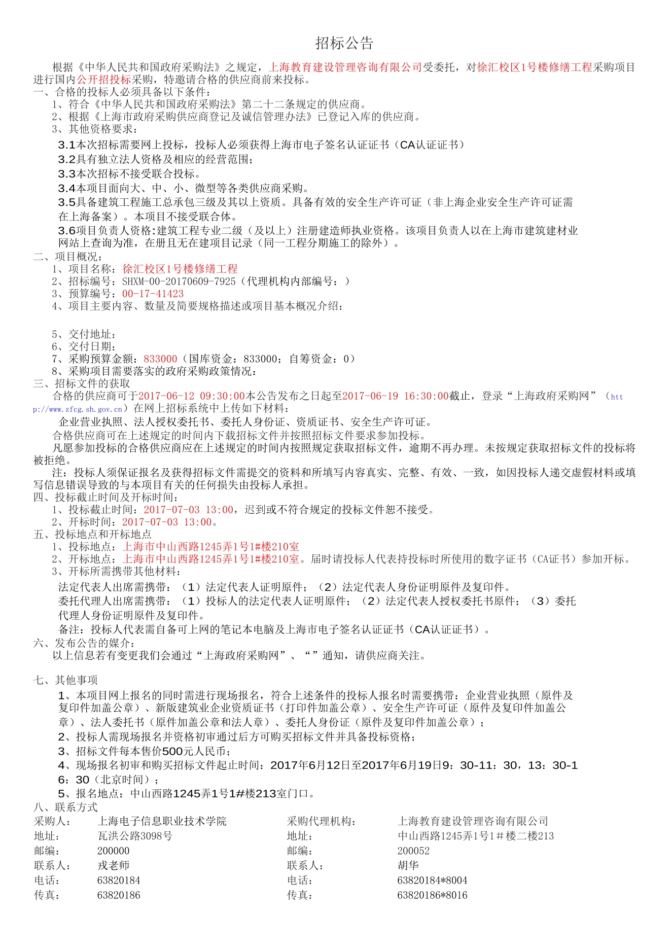 徐汇校区1号楼修缮工程招标公告