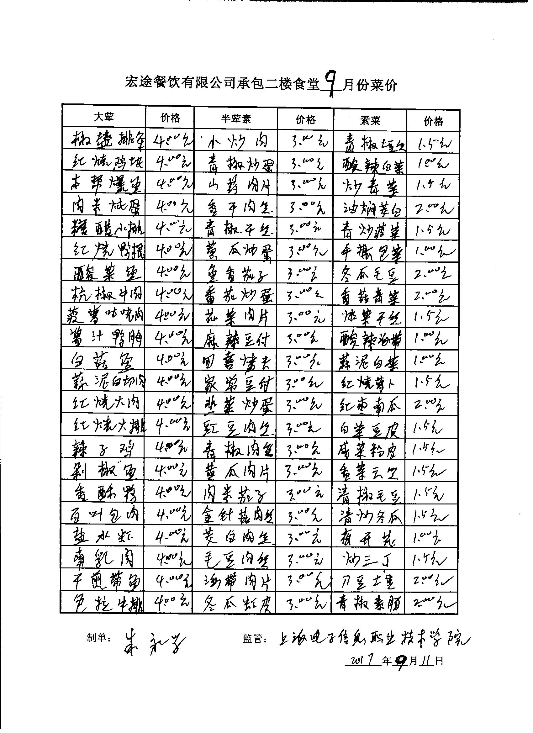 二楼食堂9月菜价