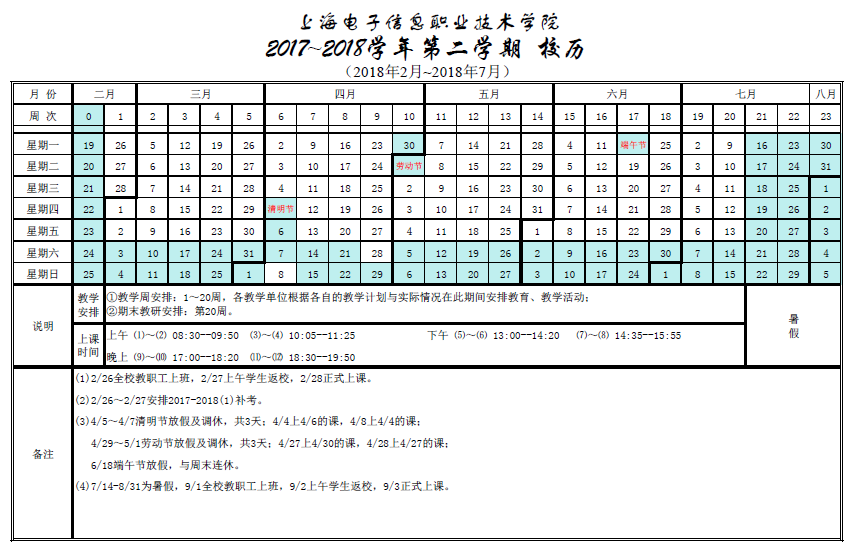 2017-2018学年第二学期校历