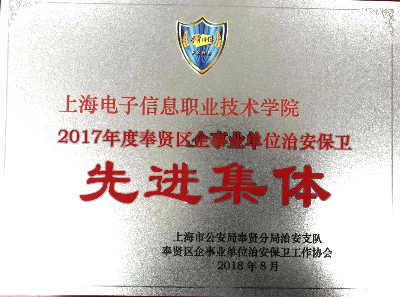 上海市公安局奉贤分局治安支队、奉贤区企事业单位治安保卫工作协会,授予我校2017年度“奉贤区企事业单位治安保卫先进单位”荣誉称号。