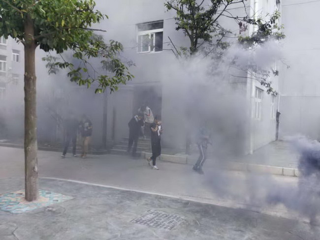 11月14日下午12:30,生活园区突然烟雾四起,警报之声遍布整个生活园区。瞬间各楼道传来“嗵嗵嗵…”的脚步声,只看见同学们一个个捂鼻、弯腰,靠墙行进,快而不乱,井然有序,全部安全撤离到指定场地。