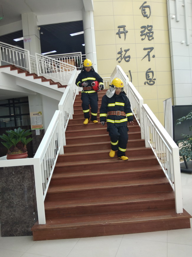 演练假设在生活园区十三号楼西面发现火情,要求微型消防站队员立即赶往现场灭火。接到报警以后,微型消防站队员迅速穿上消防服并携带消防水带、水枪等赶赴模拟火灾现场。每组两名队员,分工明确、配合默契,熟记操作步骤,达到了初期火灾扑救的初衷。