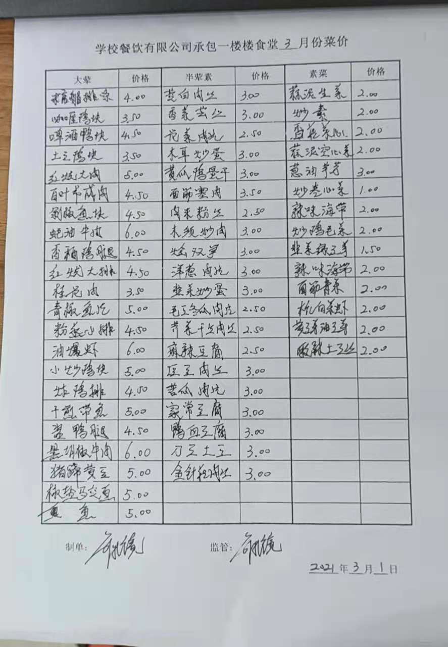 一楼食堂3月菜价