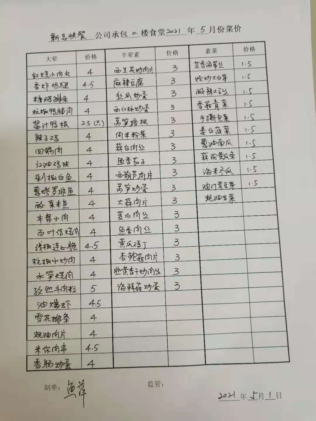 二楼食堂5月菜价