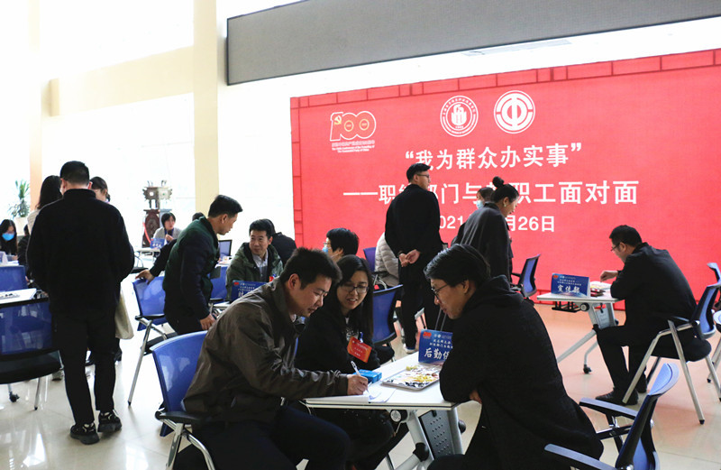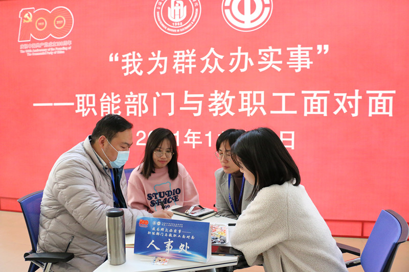 2021年11月26日中午,学校召开四届二次教代会暨工代会期间,由校工会举办的职能部门与教职工面对面交流在奉贤校区B楼大厅一楼举行。