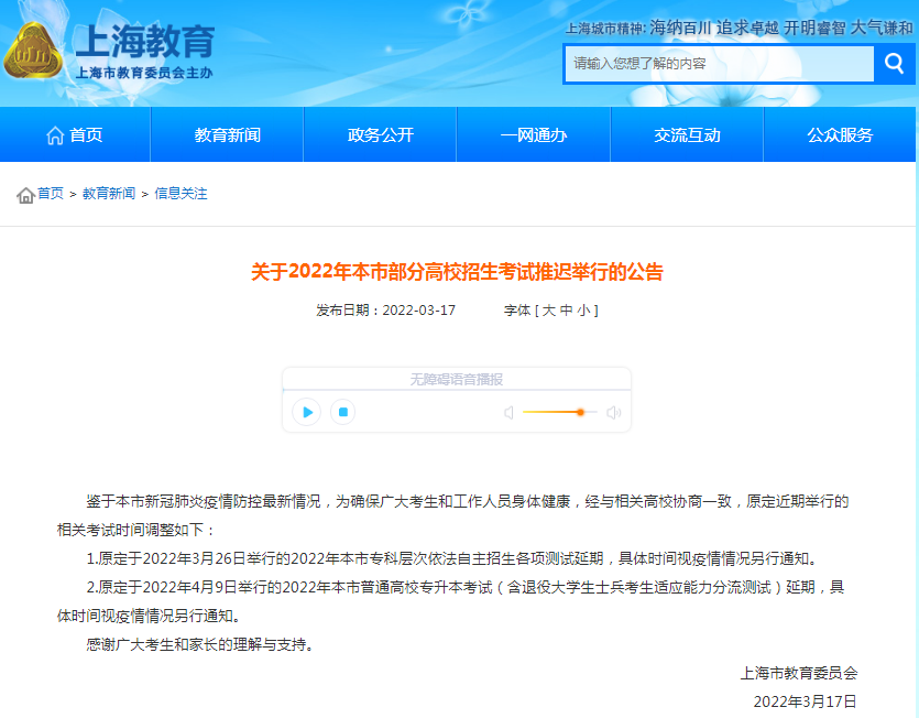 转发教委关于《2022年上海部分高校招生考试推迟举行的公告》的重要通知