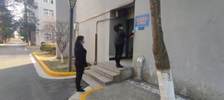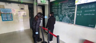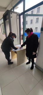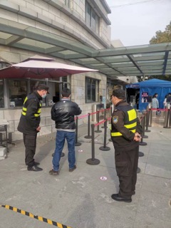 演练中模拟了“学生”进入宿舍楼,一律由小门卫(宿管协助)在门岗处进行体温检测。突然发现体温异常人员(由物业员工扮演),由小门卫立即上报物业值班经理,并由物业经理统一整理材料上报后保处负责领导知晓后,由小门卫陪同体温异常“学生”前往发热预检分诊室。(由9号楼东门进入101室)