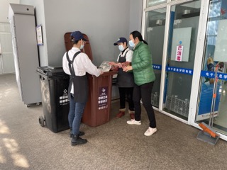 现场“师生”(由食堂员工扮演)依次通过体温检测仪,对于无体温异常人员则依次有序进入食堂大厅。进入餐厅后按照划定路线先进行餐前的手部清洗,保持好间1米距离排队,迅速取餐,用餐完毕后,经食堂南门离开,并将餐盒按照垃圾分类丢入垃圾桶。