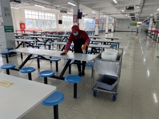 当就餐人员离开后,食堂工作人员必须及时清理桌面及地面各类垃圾,做到“每餐必清”。之后对餐桌椅进行擦拭消毒,并在每餐正式结束后进行全场范围的环境气雾消毒工作。
