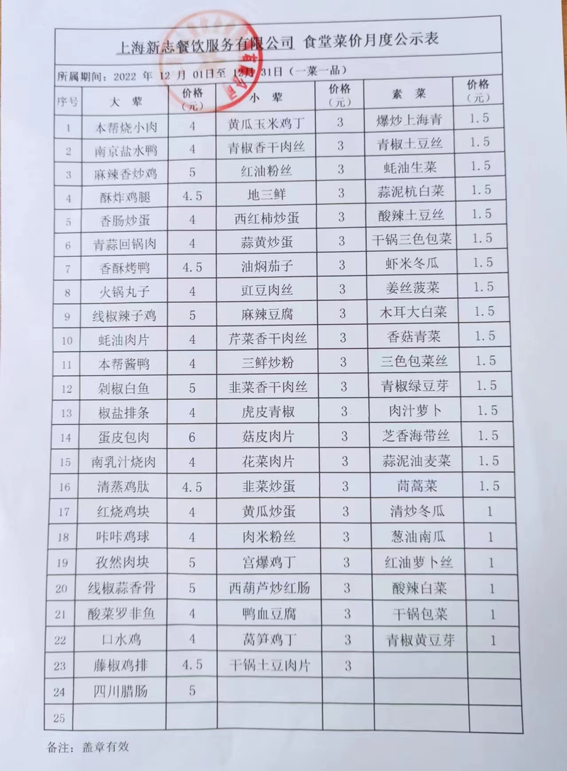 奉贤二楼白玉兰餐厅菜价公示(2022年12月)
