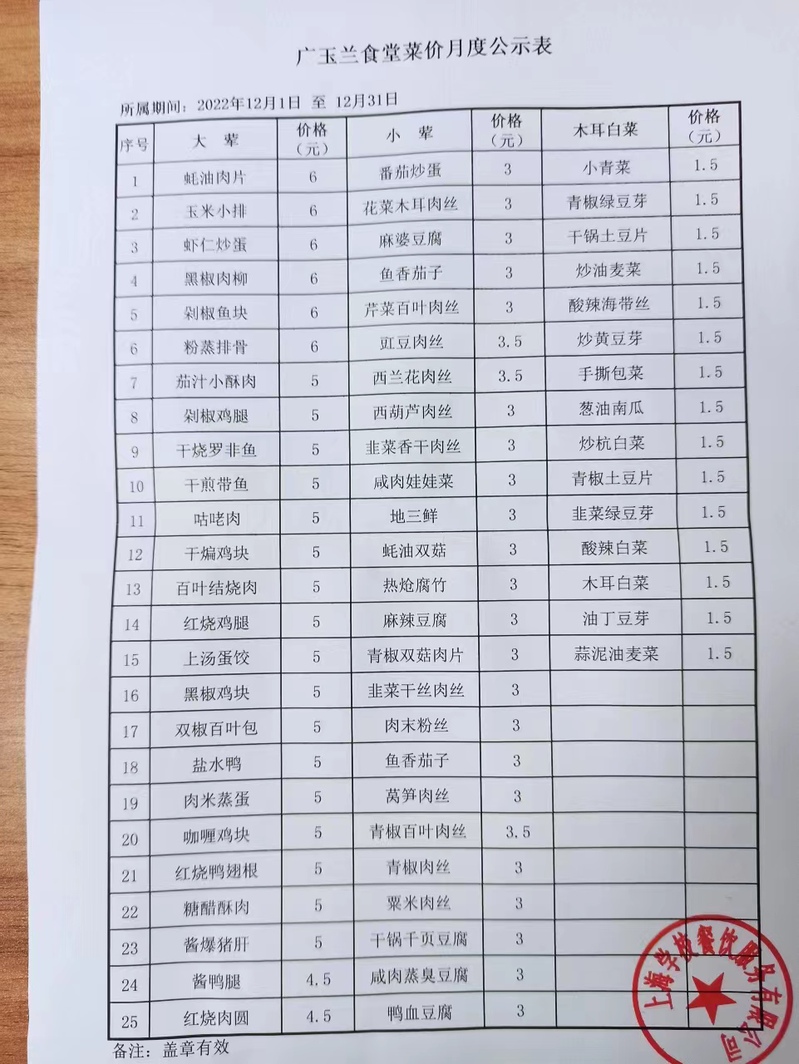 奉贤一楼广玉兰餐厅菜价公示(2022年12月)