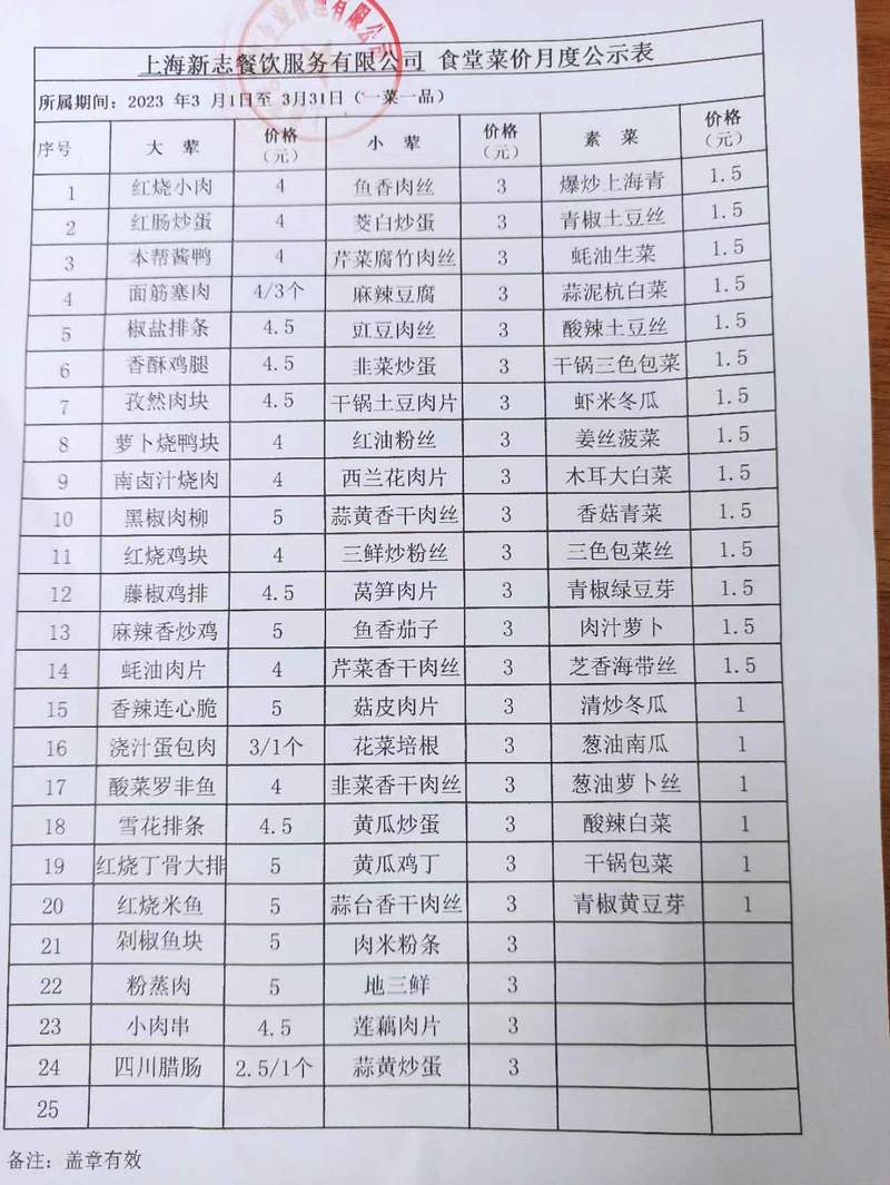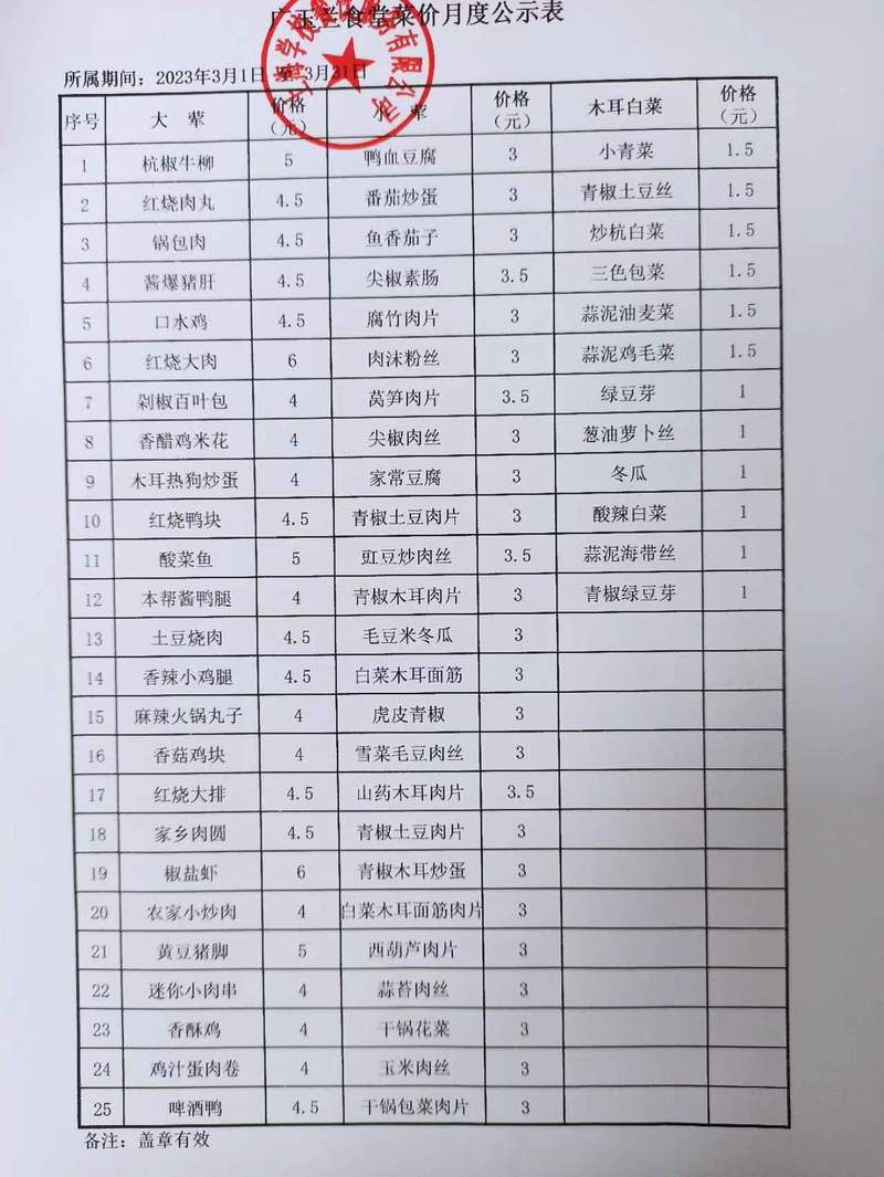 奉贤校区食堂3月份菜价公示