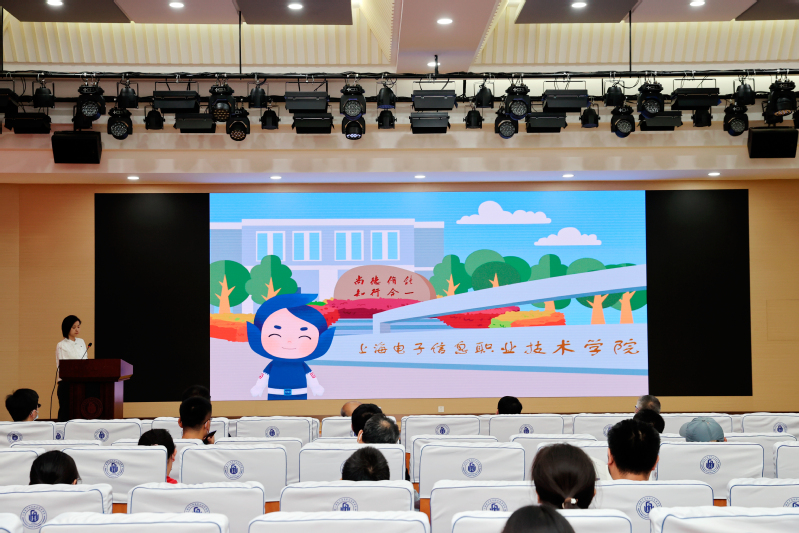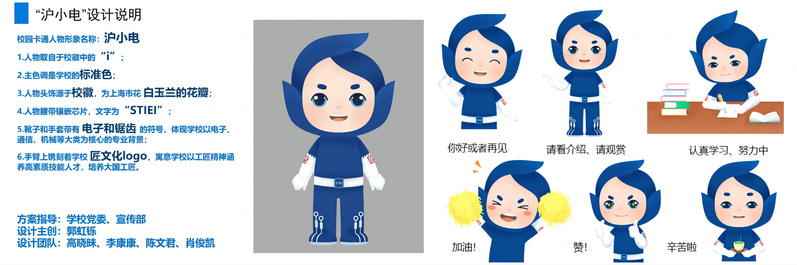 设计创作团队代表、设计与艺术学院党总支书记高晓昧发布校园卡通人物形象并释义。“沪小电”卡通人物设计的主色调是学校标准色,代表高科技力量的蓝色。人物头饰源自校徽,为上海市市花白玉兰的花瓣。人物的腰带上镶嵌着芯片,文字为学校英文简称 STIEI,靴子和手套带有电子和锯齿的符号,体现学校以电子、通信、机械等大类为核心的专业背景。手臂上镌刻着学校匠文化logo,寓意学校以工匠精神涵养高素质技能人才,培育大国工匠。
