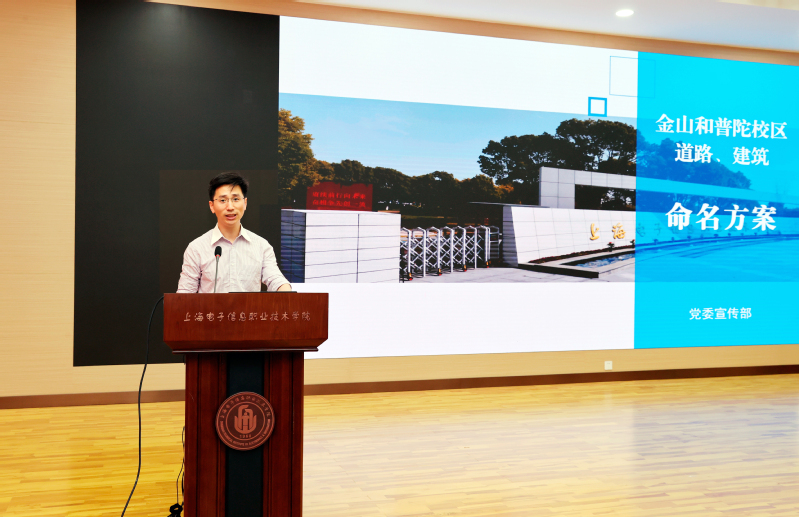 党委宣传部部长张贯彻发布《学校金山、普陀校区道路、建筑物命名方案》。求知路、求新路、承德路、承行路……金山校区横向道路以“求”字起头,寓意追求知识应从表象到真理;纵向道路以“承”字起头,寓意传承校训精神。博闻路、承德路、崇德路、崇行路……普陀校区横向道路以“博”字起头,寓意青年大学生要博闻通达、博学明道、博雅厚德;纵向道路以“崇”字起头,寓意崇尚校训精神。怀德楼、啄玉楼、敏行楼、善思楼……两个校区的建筑物命名主要体现弘扬中华优秀传统文化,从文学经典中选取契合楼宇功能、育人主题的关键词。