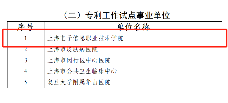 近日,上海市知识产权局公布了《关于认定2023年上海市企事业专利工作试点示范单位的通知》,我校成功入选2023年上海市专利试点事业单位,成为自2011年上海市建设专利工作试点示范单位以来唯一入选的高职高专院校。