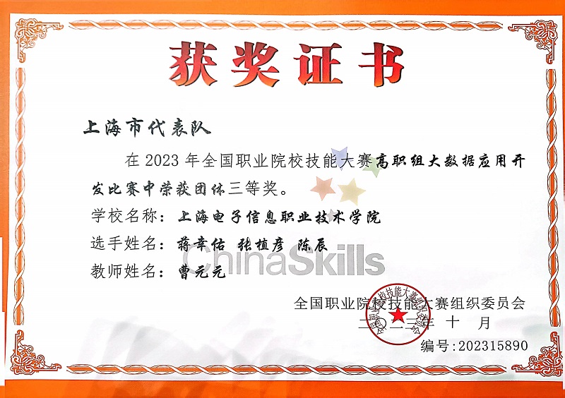 10月23日,2023年全国职业院校技能大赛大数据应用开发赛项在海南省琼海市南海博物馆举行。本次比赛采用师生同赛形式进行,我校通信与信息工程学院教师曹元元和学生蒋幸佑、陈辰、张植彦组成的参赛队参加比赛,与来自全国64所高职院校参赛队同场竞技。经过一天紧张激烈的竞技,我校参赛队获得三等奖。