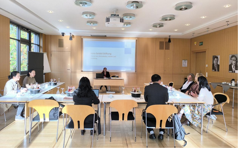 代表团拜访了汉斯·赛德尔基金会慕尼黑总部,受到基金会国际合作所东北亚处处长Veronika Eichinger女士、项目协调员Röttgermann女士及Simona Thomas女士的热情接待。Eichinger女士介绍了基金会的发展历史、组织架构、功能职责、工作成就和面临的新形势新问题,方校长从技术员培训、德国职业教育教学模式推广应用、西部职业教育对口帮扶等方面详细汇报了我校中德合作项目的进展情况及其深远影响,希望双方在疫情之后重新建立良好关系,持续做好原有工作,并在专业建设、师资培养等方面得到基金会更多的支持。王院长对基金会的精心安排和陪伴表示衷心的感谢,她回顾了代表团两天的工作成果,并对基金会与中德工程学院继续开展合作、拓展合作内容提出了想法,包括树立中德合作人才培养的样板、支持职教领域绿色发展、深化沪-滇-德合作等方面的内容。基金会高度肯定了我校中德合作运营团队近四十年来所取得的巨大成就,并高兴地表示上海电子信息职业技术学院代表团是疫情结束后第一个到访的国际代表团,本次面对面的交流目标明确、理念创新、信息量大、效果显著,今后,双方都应该坚持合作理念,共同探讨如何在变化的形势下持续开展工作,将合作想法逐一落实。