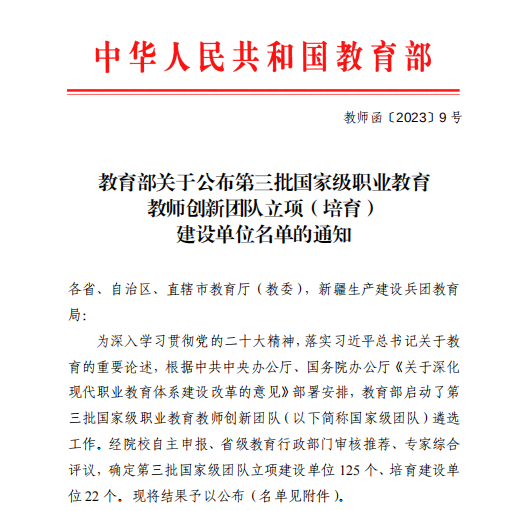 近日,教育部发布了《教育部关于公布第三批国家级职业教育教师创新团队立项(培育)建设单位名单的通知》,我校入选第三批国家级职业教育教师创新团队立项建设单位名单,“集成电路技术”获批第三批国家级职业教育教师创新团队立项团队。