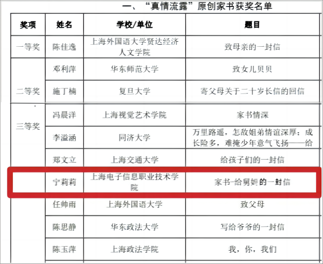 家书,是亲人间交流的桥梁,也是传承家风家训的重要途径。今年9月-12月,上海市图书馆学会阅读推广委员会主办、上海市各高校、公共图书馆共同承办了展“见字如面 滋养心灵”——2023“创新树”杯家书创作大赛暨家书作品征集活动。我校宁莉莉老师的原创家书《给舅妈的一封信》荣获三等奖。