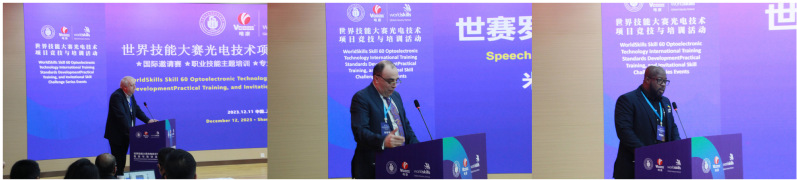 陈屹宁代表世界技能组织致辞,并介绍了本次活动的主题、目的、内容及意义。他表示,本次活动主题聚焦于高速发展的光电技术领域,不仅是一次培训和竞赛活动,还是光电领域中最优秀的技能从业者和教育工作者聚集在一起学习、分享和启发的大好机会。活动的举办挖掘了全体参与者专业技能、相互沟通和团结协作的潜力,推动了光电技术领域的可持续发展,开辟了一条通向未来之路的平台,让科技和人类技能相协调,创造了一个更加互联、高效和创新的世界。让我们共同努力,使本次活动成为光电、世界技能大赛和职业教育与培训领域有意义且有影响力的活动。